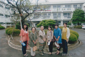 (千葉典子先生を囲んでの旧校舎訪問の様子)