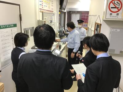 収録に臨む本校放送部員3名。緊張の面持ちです。駅員の方から「JRは『ジェーアール』ではなく『ジェイアール』と読んでください」と助言を頂きました。なるほど。
