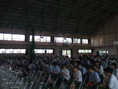 今年度は感染症対策を行いながらの開催となりました。体育館の入り口では実行委員の生徒が入場する生徒の手指の消毒を行ったり、会場の後ろ半分を空けることで、会場に人が入りすぎないように対策しました。また、当日は気温も高く、スプリンクラーでグラウンドに水をまくなどの対策を行いました。