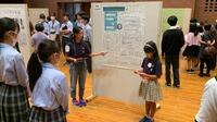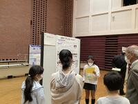 はじめに本校高校2年生アドバンスコースの生徒が課題研究発表を行いました。続いて、参加した小学生の発表が行われました。指示棒を使ってはじめはやや緊張した面持ちで、しかし堂々と発表しました。発表後は高校生やティーチングアシスタントの大学生からの質問にも答え、高校や大学の先生からも助言や激励の言葉をもらいました。一人合計3回の発表のあとは、どの参加者も目の輝きが増していたようでした。